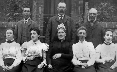 This photograph was taken in front of Shellaker Lodge Farm. On the back row from left to right John, William and the father Richard. Seated on the front row Nellie, Polly, Mary (mother), Sarah and Emma.