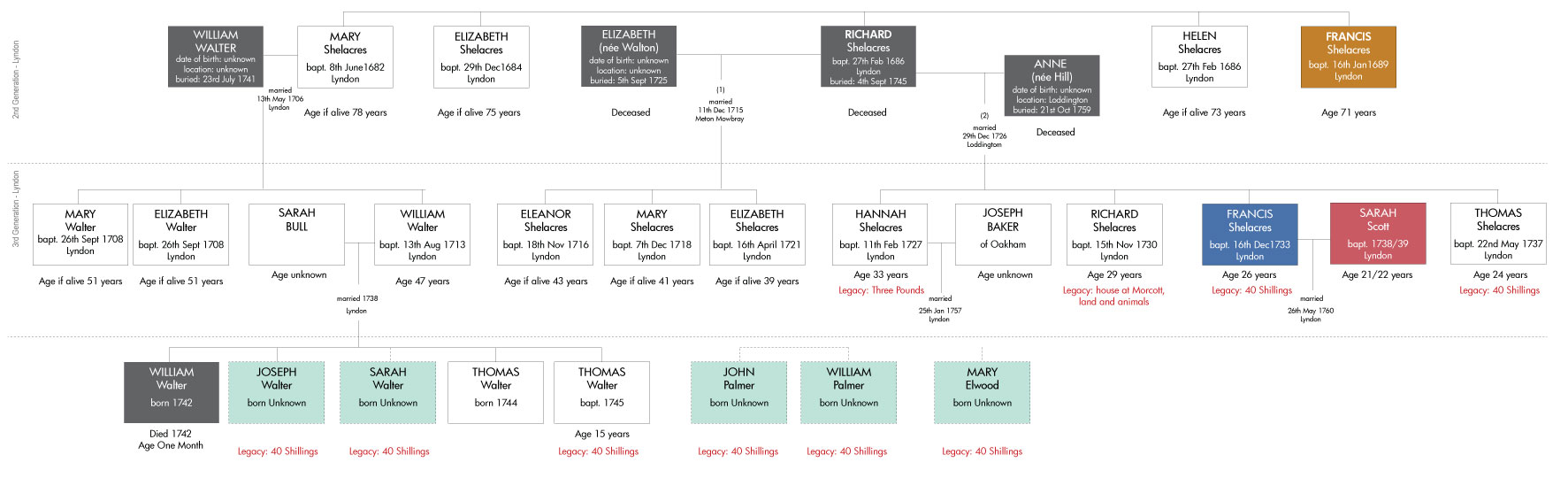 NB – As MARY WALTER (née SHELACRES) is not mentioned in her brother’s Will suggests very strongly she had died at that time. Her age when Francis made his Will would have been 78 years. If she was alive when her brother Francis died she would have been around 97 years old. Conclusion: she probably died prior to 1760.