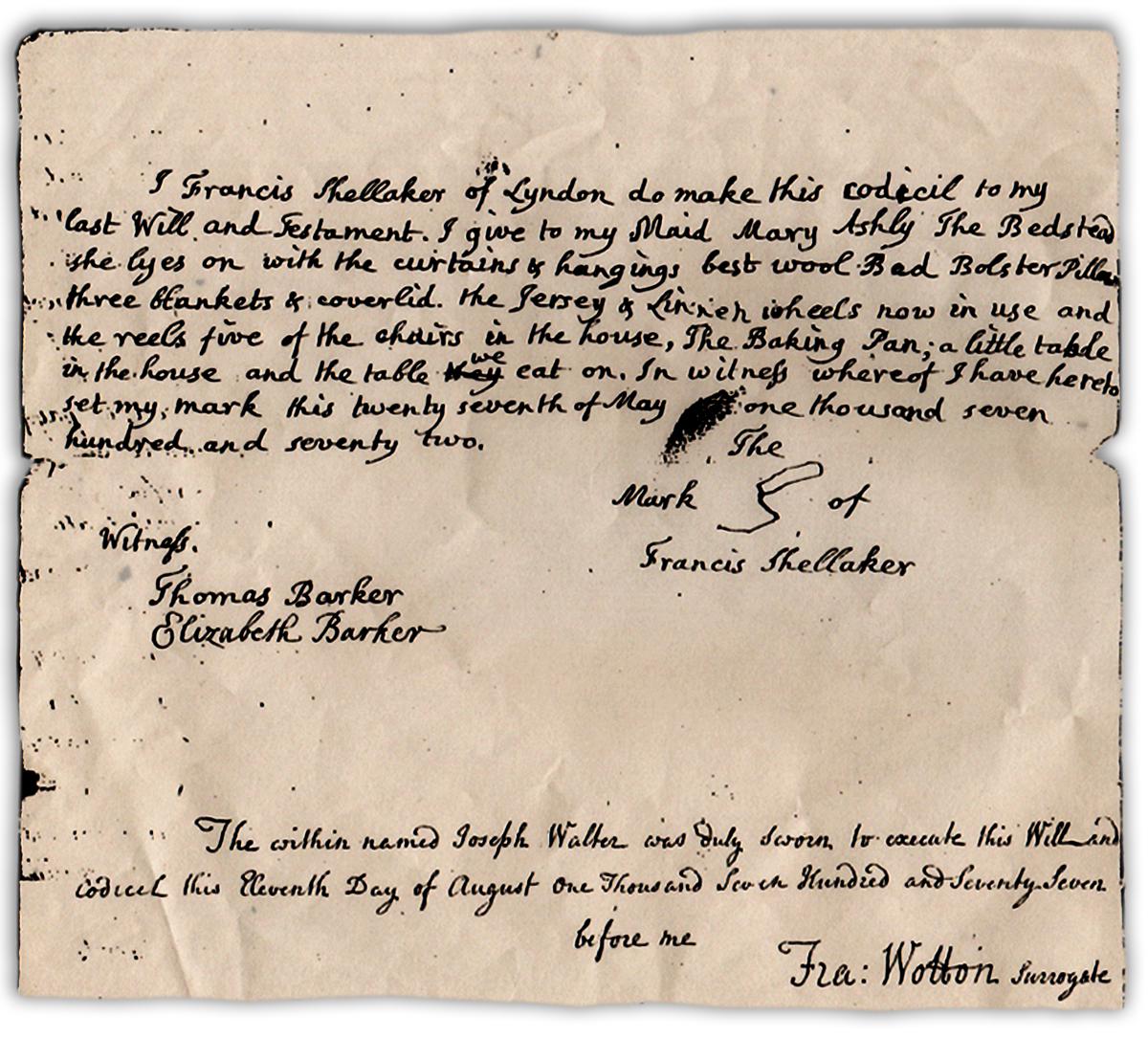 I Francis Shellaker of Lyndon do make this codicil to my last Will and Testament. I give to my maid Mary Ashly 16 the Bedstead she lyes on with the curtains and hangings, best wool Bed Bolster Pillow, three blankets and coverlid. The Jersey & Linen wheels 17 now in use and the reels five of the chairs 18 in the house, the Baking Pan; a little table in the house and the table we eat on. In witness whereof I have hereto set my mark this twenty seventh of May one thousand seven hundred and seventy two. 19