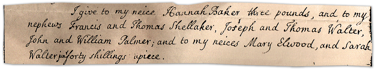 This section is slightly misleading to me; Hannah clearly receives three pound but do the nephews (Francis, Thomas, Joseph and Thomas Walter, John and William Palmer) also received that same amount? Or do these nephews receive the same amount, forty shillings, which was bequeathed to nieces Mary Elwood and Sarah Walter Jnr?