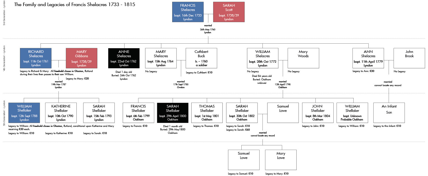 Francis Shellaker born in the village of Lyndon in the County of Rutland in 1733. He married Sarah Scott of the same parish in 1760. This Will was signed on 21st July 1814 when had he reached at the advanced age of 81 years. He died the following year, 1815 and was buried in Lyndon Churchyard…..