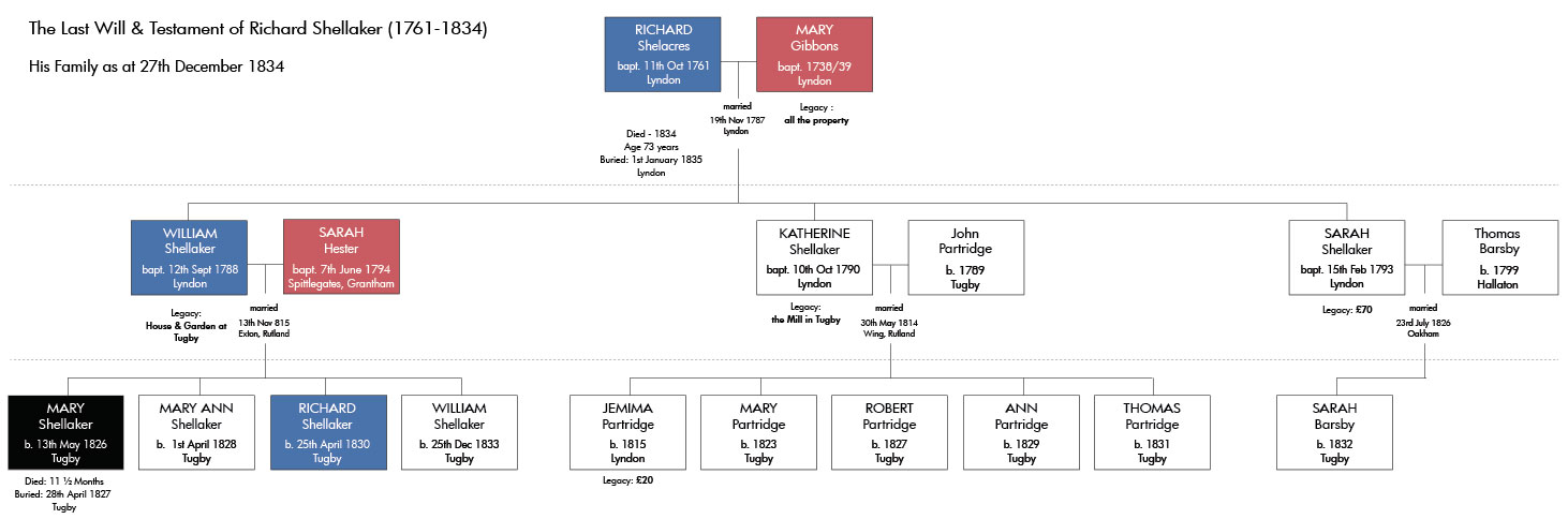 Richard Shellaker was born in Lyndon, Rutland in 1761. He married Mary Gibbons in that parish church in November 1787. This Will was signed on 27th December 1834 when he was 73 years old. Richard died a few days after making his Will and he was buried in Lyndon Churchyard on the 1st of January 1835.