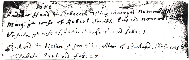 1686 – “Richard & Helen ye Son & Daughter of Richard Shelacres & Elizabeth baptised Feb 27th”