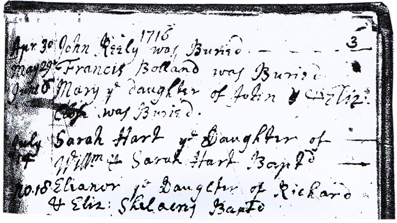 1716 – ” Nov 18 – Eleanor ye Daughter of Richard & Eliz Shelacres Bapt’d.”