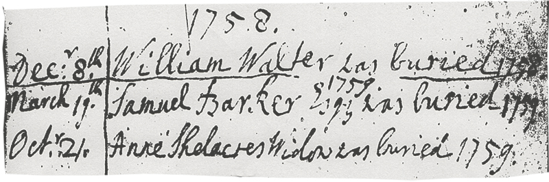 William Walter senior, the husband of Mary Walter (née Shelacres) was buried on July 23rd 1741. They had been married for over 35 years. I have found no record of Mary Walter’s (née Shelacres) death.
