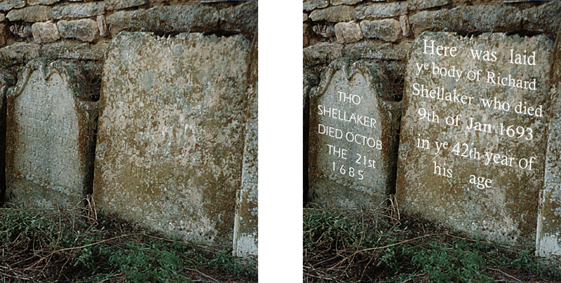 In August 1997 I visited Lyndon with my wife, daughter and my mother, and after a picnic in the churchyard, I found the gravestone of Richard Shelacres located next to that of his baby son Thomas who died, as previously mentioned, at the age of 23 months around seven years earlier in October 1685. Incredibly more than 300 years after their deaths, I was able to read the inscriptions on both gravestones. Below left is a photograph of those two gravestones taken in 1997 and on the right the same photograph onto which I’ve placed the inscriptions as they appeared on those two gravestones.