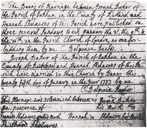 The next ceremony to take place at the village church is a far happier occasion, the wedding of Hannah Shellaker, daughter of the late Richard Shellaker and Anne. The wedding takes place on Tuesday 25th January 1757 at which time Hannah is 29 years old but only a week or so from her 30th birthday. Hannah married JOSEPH BAKER of Oakham, the country town of Rutland.