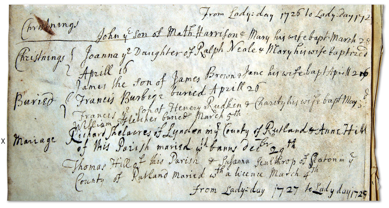 1726 – “Marriage – Richard Shelacres of Lyndon in the County of Rutland & Anne Hill of this parish maried with banns Dec’ber 29th”