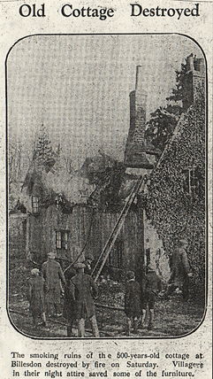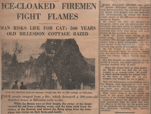 “Four people escaped from a fire, which destroyed a 500-year-old thatched house at Billesdon early today. While the flames were at their height, the owner of the house rescued his cat from a blazing room, and the keen wind froze the clothes of the firemen, and turned the flying spray from the hosepipes into icicles on their faces and hands. John William Brown, the well-known Billesdon nursery gardener and horticulturist, was awakened to-day by smoke that poured into his bedroom.