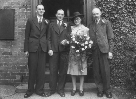The couple had two hymns on the occasion of their wedding; “We bless Thee for Thy peace, O God” and “Through all the changing scenes of life”. Pictured right are the bride & groom with John Brown and an army friend of Ken’s, George Heggs, who was the best man.