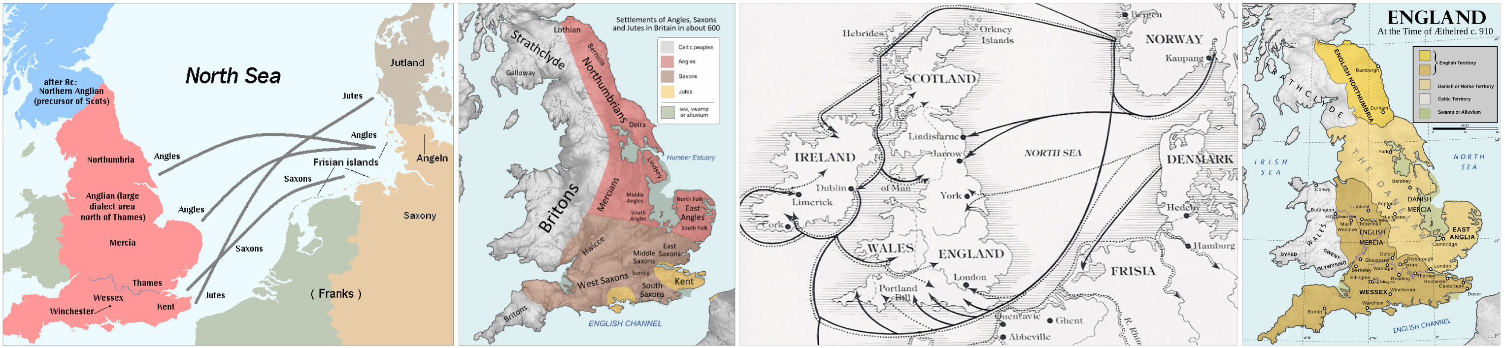 The invasion of these Germanic peoples, resulted in the establishment of ‘Anglo-Saxons’ kingdoms across most of what is now England also in parts of lowland Scotland – the map centre left, shows the approximate areas of these kingdoms.
