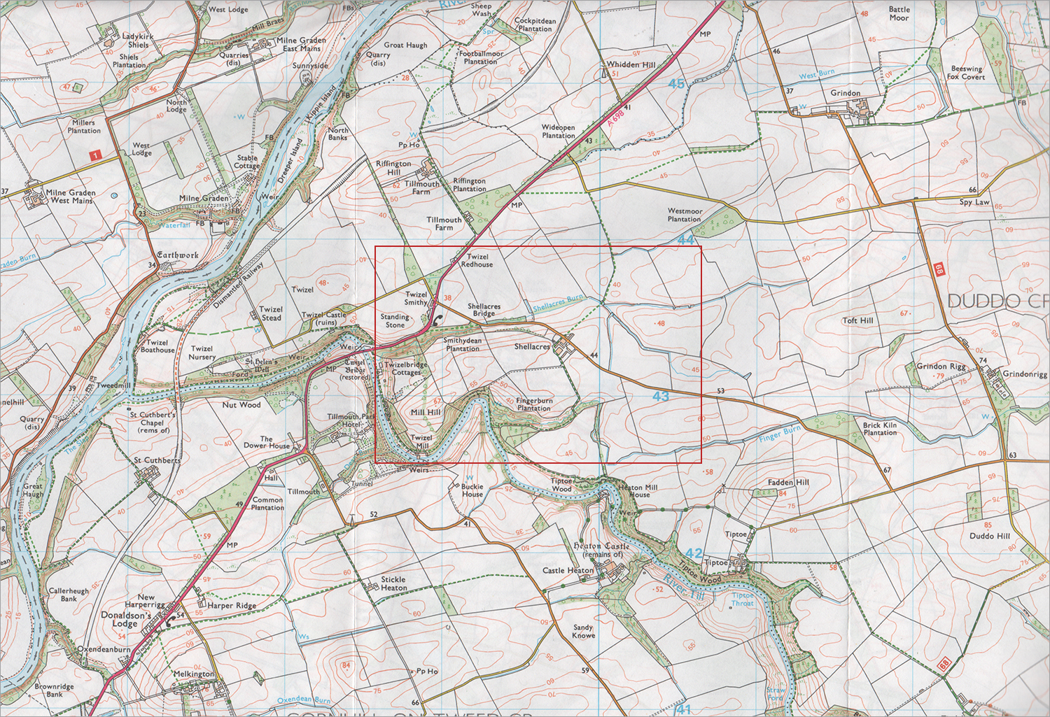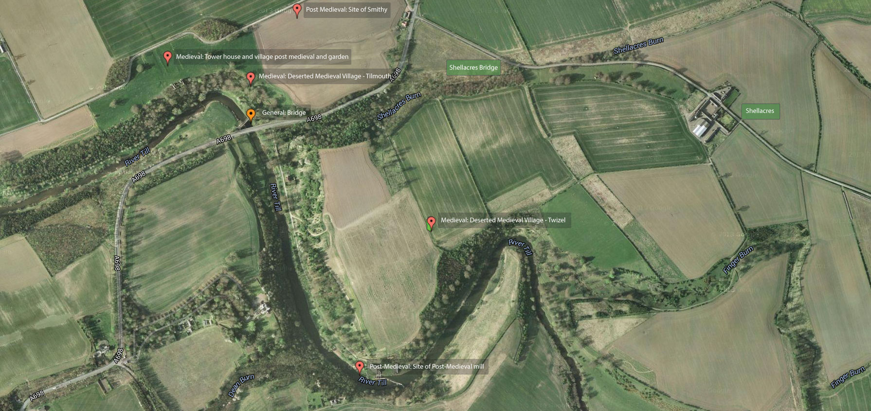 Two DMV’s in the area have been identified; one is ‘Tilmouth‘ located where Shellacres Burn mets the River Till and second is ‘Twizel‘ in the centre of the map. These DMV’s are classified as ‘medieval’ which is a period in history from around 476 AD to around 1500 AD. (The first date represents the fall of the Western Roman Empire but apparently the end of the medieval period is debatable – some say it was the Discovery of America (1492), others count the date as being the Beginning of the Reformation (1517).
