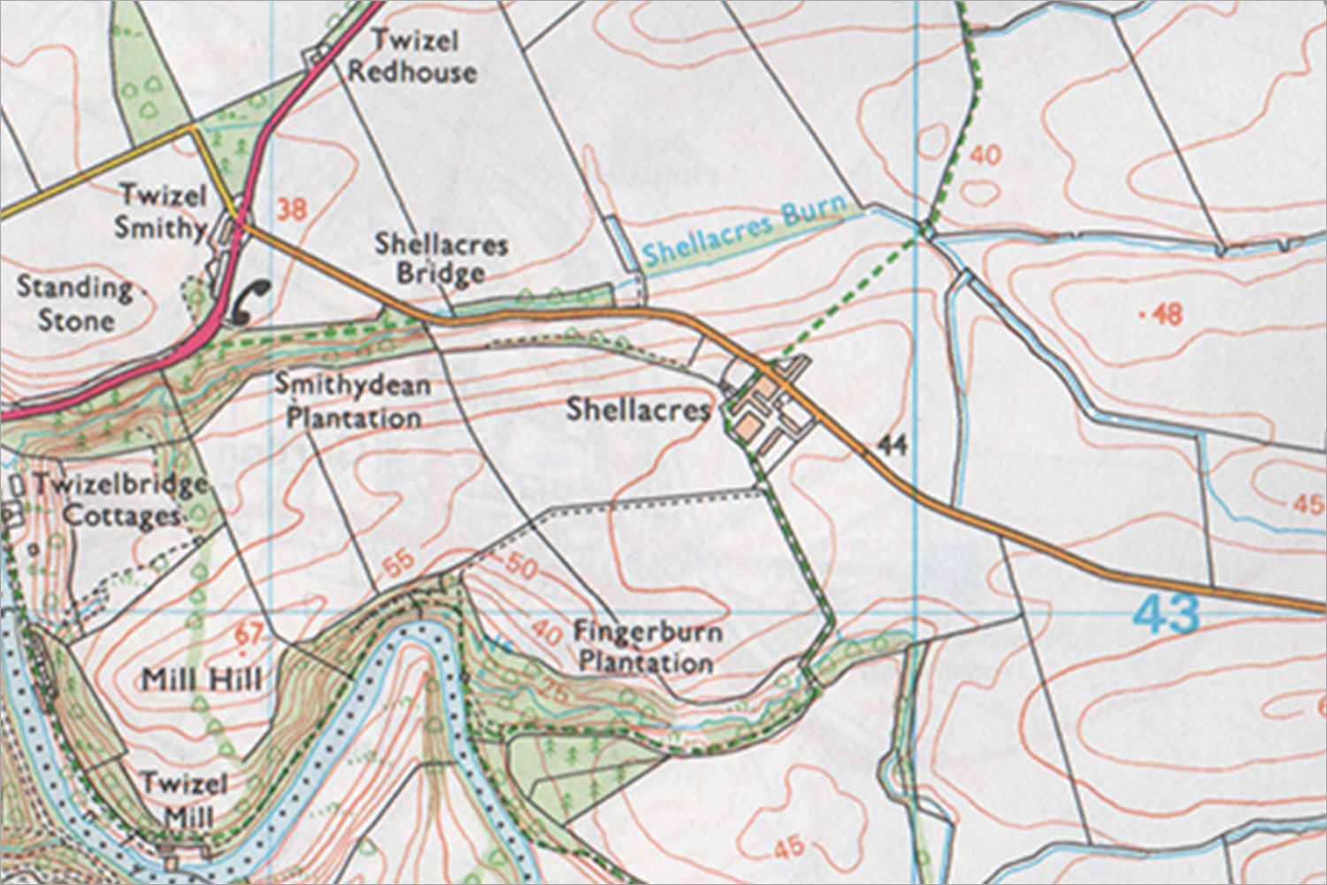 The settlement of Shellacres can be seen on Ordnance Survey map 339 – ‘Kelso, Coldstream & Lower Tweed Valley‘ – a section of which is shown on the right.