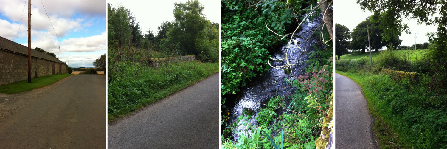 The farm buildings of Shellacres Farm looking east – The Wall of the North Side of Shellacres Bridge – Shellacres Burn – The South Wall of Shellacres Bridge