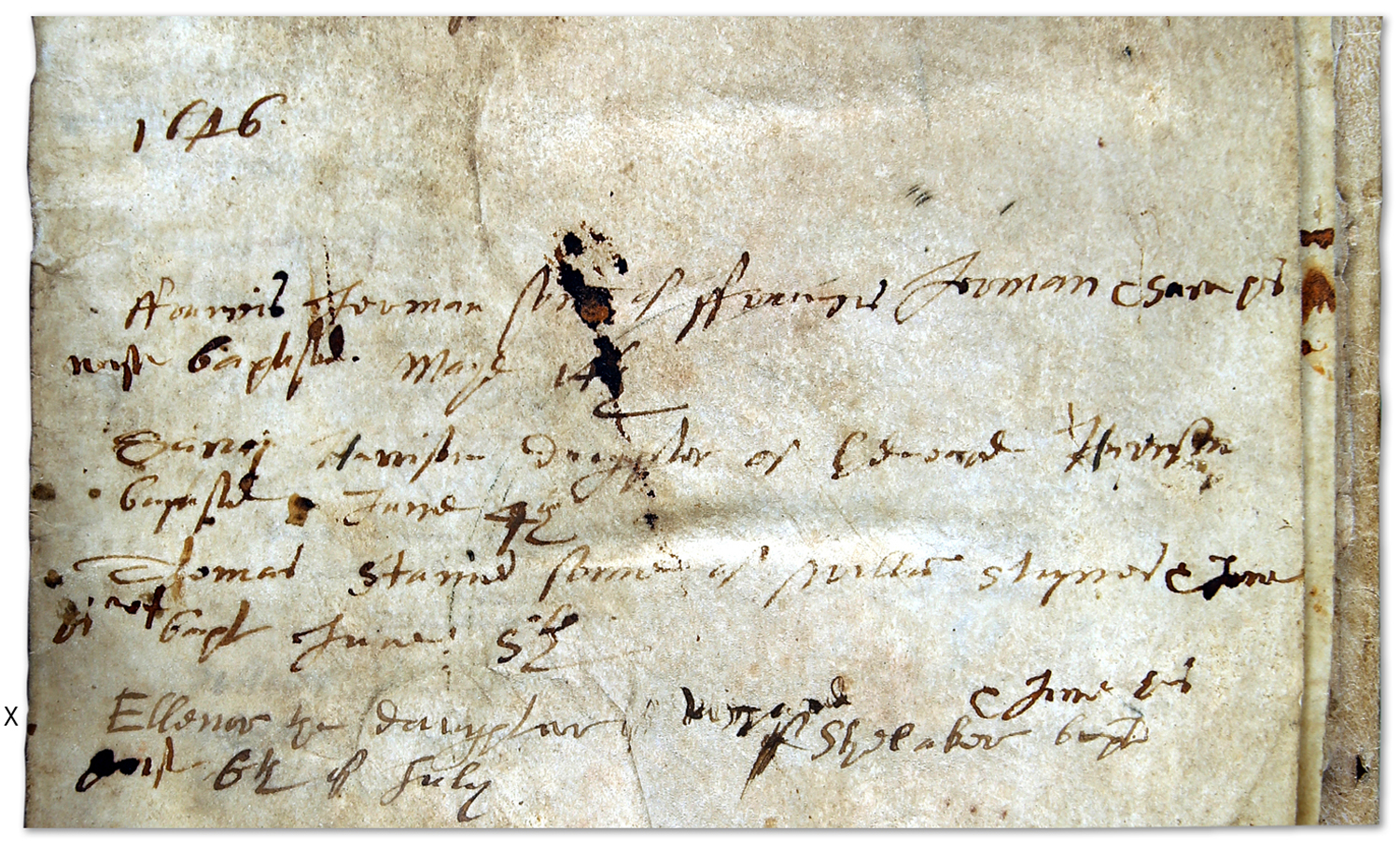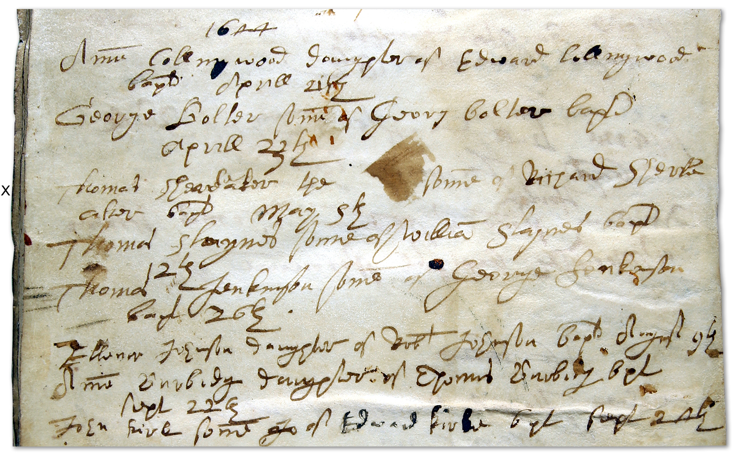 The record of the baptism of Thomas Sheaeleaker is below and is the third entry for 1644. I have marked the first line of the entry, which runs over two lines, with an ‘x’. The father’s surname is spilt over those two lines.