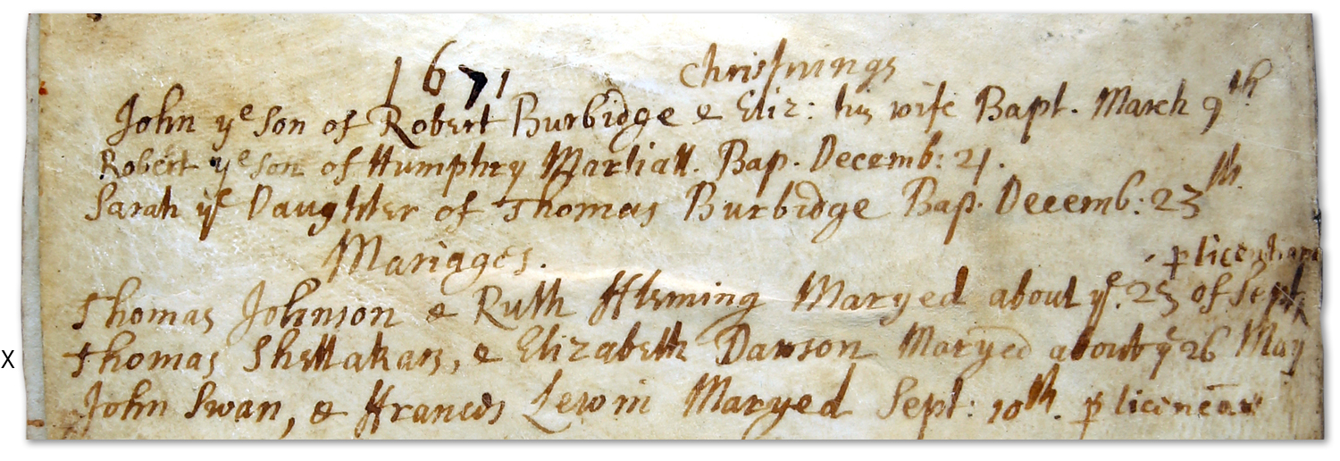 1671 “Thomas Shellakars & Elizabeth Dawson Maryed about 26th May”
