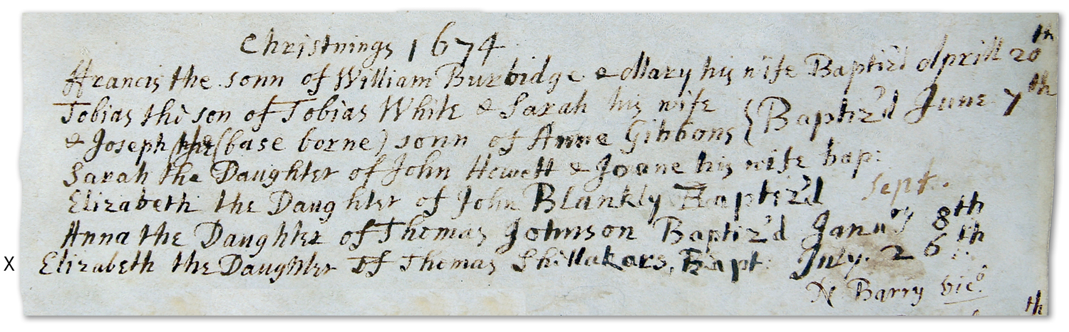 1674 – “Elizabeth, the Daughter of Thomas Shellakars, Bapt July 26th.” “N. Barry. vic.”