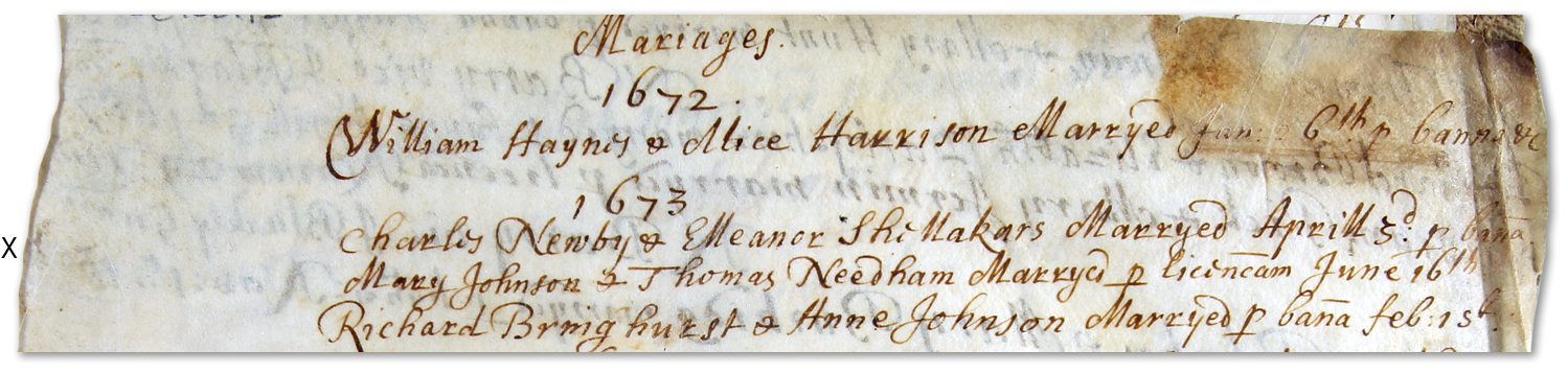 1673 “Charles Newby & Elleanor Shellakars Marryed April 3rd per bann.”