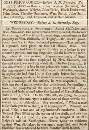 AN UNFORTUNATE DISCOVERY. – Sarah Shillaker and Wm Shillaker, two aged persons, were indicted, the former for stealing, and the latter for receiving, a counterpane the property of Wm. Shilcock, of Tugby. – Mr. Cockle prosecuted, and Mr. O’Brien defended prisoners.