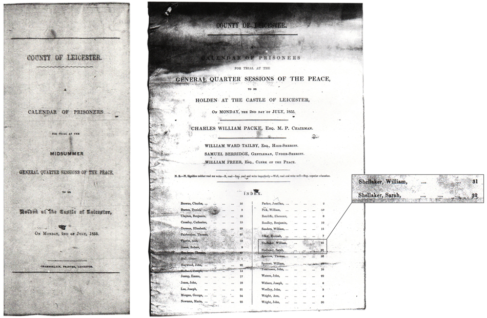 The couple are listed in the document below, which is a ‘Calendar of Prisoners’ for the County of Leicester for the Midsummer General Quarter Sessions held on the 2nd of July 1855 at the Castle at Leicester. I have enlarged the section of the Calendar of Prisoners, below right, showing the names of William Shellaker and Sarah Shellaker.
