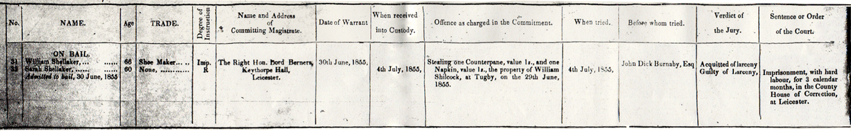 The name and address of the committing magistrate is shown as being The Right Honourable Lord Berners of Keythorpe Hall – which adjoins the village of Tugby. The warrant for the arrest of William & Sarah Shellaker was dated Saturday 30th June 1855 with their trial taking place the following Wednesday, the 4th July which was also the date they were taken into custody. The words ‘On Bail’ appears on the document above William & Sarah’s names, suggesting they were not imprisoned prior to their trail, unlike all the others who appeared in front of the magistrate that day, but were released on bail, possibly due to their age. The offence is recorded as ‘Stealing one Counterpane, value 1s., and one Napkin, value 1s., the property of William Shilcock, at Tugby, in 29th June 1855′.