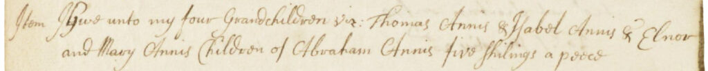 I give unto my four grandchildren viz Thomas Annis, Isabel Annis, Elinor