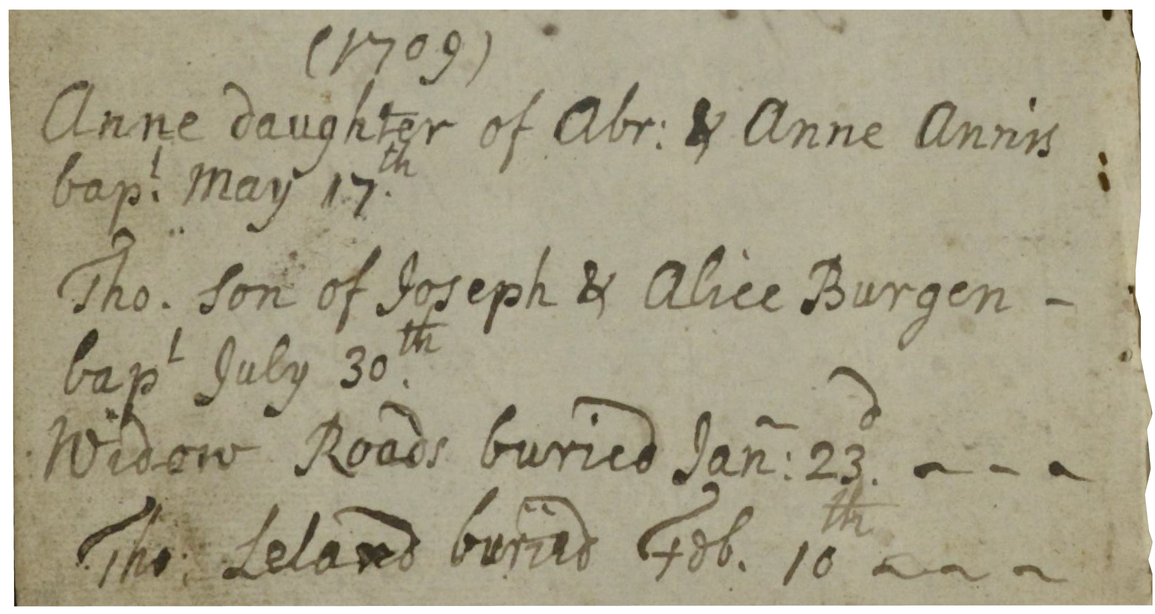 17th May 1709 – The baptism of Anne Annis the daughter of Abraham and Anne Annis