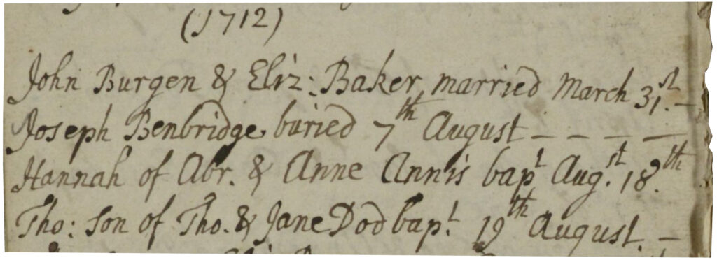 18th Aug 1712 – The baptism of Hannah Annis the daughter of Abraham and Anne Annis
